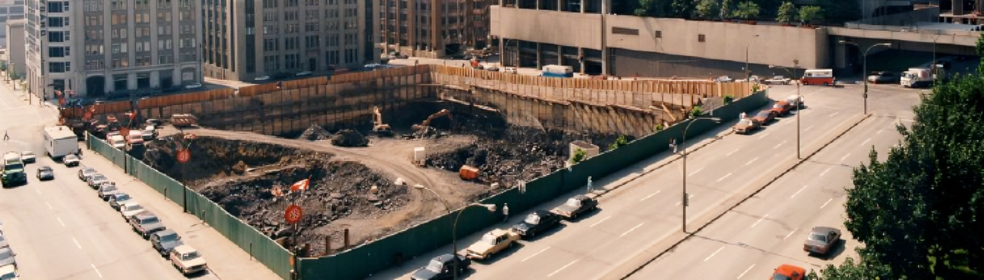 À la fin du 19e siècle, l’on retrouvait sur le site de l’édifice Le 1000, une rangée de maisons mitoyennes à trois étages faites de pierre grise, typiques de l’architecture d’époque du square Dominion. Par la suite, le côté sud du square a pris un caractère plus commercial et durant les années 20, ces charmantes maisons furent transformées en boutiques, restaurants et hôtels. Elles furent démolies au début des années 60, dans le cadre de la construction de la Place Bonaventure.